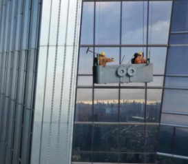 清潔公司的工作人員借用吊籃從上到下進行擦拭作業,在作業過程中為了確保人身安全,在高樓的上空一個固定點處懸掛上高空作業防墜器,并將防墜器的下掛鉤和自身所佩戴的安全帶相連接,在清理幕墻時,防墜器的鋼絲繩隨著人員的流動而自由伸縮。